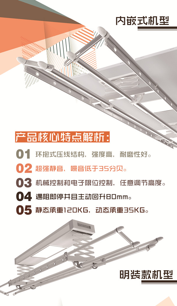 遙控自由升降,滿足不同身高,不同的需求,簡(jiǎn)單的操作系統(tǒng),即便你的父母不識(shí)字,也可輕松操作!讓冬衣的晾曬毫不費(fèi)力!